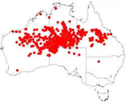 It is native to southern and central parts of the Northern Territory,[6] the north western corner of South Australia,[2] central Queensland[1] and the Kimberley, Pilbara and Goldfields regions of Western Australia where it is found on dunes and sand plains growing in shallow stony or red sandy soils often around laterite.[7] It is usually found as part of open Eucalypt woodland or spinifex communities.[3]