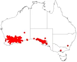In Western Australia it is native to an area in the Goldfields-Esperance and Wheatbelt regions of Western Australia where it is commonly situated on plains, low-lying areas and around salt lakes where it grows in sandy clay, sandy, loamy, calcareous or lateritic soils.[2] In Western Australia the range of the shrub extends from around Wubin in the north west to around Pingrup in the south west extending out to around Madura in the east. It is also found in South Australia along coastal areas of the Nullarbor Plain to around Moonta in the north east and Maitland in the south east on the Yorke Peninsula.[1]