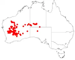 It is native to the Mid West, Pilbara and Goldfields-Esperance regions of Western Australia[2] as well as southern parts of the Northern Territory and northern parts of South Australia where it is often situated on flats or undulating plains and on rocky hills growing in red-brown loamy, silty loamy, sandy loamy or clay-loam soils although it also less frequently found in clay often over hardpan or in skeletal soils as a part of mixed Eucalyptus shrubland communities that usually have a cover of spinifex.[1]