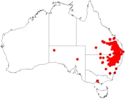 The plant is endemic to Queensland and New South Wales. It is found in New South Wales on the eastern tablelands and slopes of the Great Dividing Range, from around Tamworth and Barradine in the south extending north into Queensland. It is often found among granite outcrops as a part of dry sclerophyll forest and woodland communities.[2]