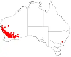 It is native to Wheatbelt, Mid West and Goldfields-Esperance regions of Western Australia and the plant will grow in sandy, loamy or lateritic soils and is often found on plains, rises and granite outcrops.[2] The range extends from approximately 100 km (62 mi) north of Kalbarri in the north west down to around 60 km (37 mi) south of Norseman in the south east.[3]