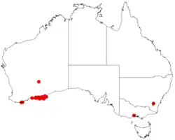 It is often situated on coastal sand dunes, on granite hills and among rocks growing in grey or white sandy soils along the south coast of Western Australia in the Goldfields-Esperance regions.[1] The bulk of the population extends from around Barker Inlet, about 50 km (31 mi) west of Esperance in the west out to around Israelite Bay in the east and extending inland to near Howick Hill, and is also found on several islands in the Recherche Archipelago usually as a part of heath and scrub communities.[2]
