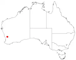 It is native to a small area in the Wheatbelt region of Western Australia where it is commonly situated in gullies growing in clay soils over and around areas of greenstone.[3] It has a limited distribution in the Wongan Hills where it is usually a part of mixed scrubland communities.[4] It is known from only two populations consisting of 49 mature plants in total found in the Shire of Wongan-Ballidu in an area of remnant natural vegetation where an estimated ninety five percent of native vegetation has been cleared for agricultural purposes within the Shire as a whole. One population is located on private property and holds forty seven percent of mature plants the other population is found in a nature reserve and contains the remainder of the mature plants.[2]