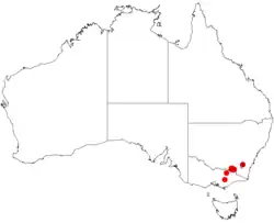 Its distribution is limited to a small area on the border between south-eastern New South Wales and north-eastern Victoria.[6] In New South Wales it is found along the southern edge of Woomargama National Park and has an estimated population of 2000 plants. In Victoria it is found in the Burrowa-Pine Mountain National Park from two stands east of the summit of Pine Mountain with nine plants in one stand and between 150 and 250 in the other. The Victorian populations are located approximately 35 km (22 mi) from the New South Wales populations.[1]