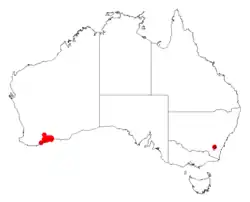 It is native to an area in the Great Southern and Goldfields-Esperance regions of Western Australia where it is commonly situated on rocky cliffs, along watercourses, on sandplains and on coastal cliffs and dunes growing in sandy or loamy or clay soils often over or around limestone, laterite or quartzite.[1] Its distribution extends from around Beaufort Inlet in the west to around Munglinup in the east, the bulk of the population being found in Fitzgerald River National Park with an isolated population between Lake King and Newdegate to the north west.[2]