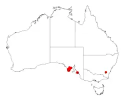 It is found on the southern Eyre Peninsula and has a disjunct population near Finniss in the south Lofty region. It mainly grows in sandy or hard alkaline soils, in open scrub or woodland.[6]