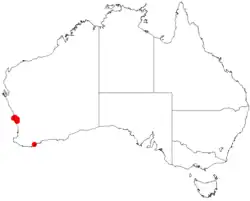 The species is found around Dandaragan in the Mid West region of Western Australia where it grows mostly in loamy and clay soils, often overlying sandstone or siltstone and is common in drainage lines.[2] It is often found along watercourses in the understorey as a part of Eucalyptus wandoo and Eucalyptus loxophleba woodland communities.[5]
