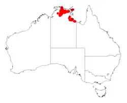 It is native to the top end of the Northern Territory including Maria Island in the Gulf of Carpentaria where it is usually situated on rocky sandstone pavements on plateaux or alluvial flats where it is found growing in sandy or loamy or sandy-silty soils or over around laterite as a part of Eucalyptus woodland or in heathland communities.[1]