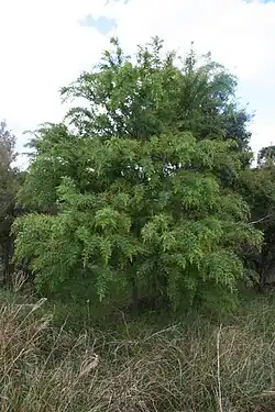 Acacia pubescens grows as a shrub to small tree anywhere from 1 to 5 m (3 to 20 ft) high. The smooth bark is grey-brown in colour, and the branches can have a slightly drooping or weeping habit. Like all wattles, the downy wattle has leaf-like structures known as phyllodes which are compound (pinnate) and measure 1.5–6.5 cm (0.59–2.56 in) in length with 3 to 12 pairs of smaller "leaves" or pinnae, each 0.5–2.5 cm (0.20–0.98 in) long, and themselves composite - composed of 5 to 20 pairs of pinnules.