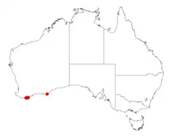 It has a discontinuous distribution and is native to an area in the Great Southern and Goldfields-Esperance regions of Western Australia where it is commonly situated in damp areas, among granite boulders or on lateritic rises growing in sandy or loamy soils over granite or laterite.[2] It is commonly part of Eucalyptus marginata woodlands and is found from the east of Albany to around Mount Manypeaks and another population is found around Mount Arid, much further to the east.[1]