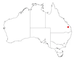 It is endemic to a small area on the Binjour Plateau in south eastern Queensland near Gayndah growing in red loamy soils as a part of heathland or open Eucalyptus woodland communities.[2]