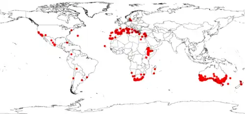 - Acacia saligna (GBIF) Map of herbaria records showing something of its invasiveness