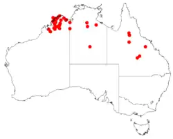 It is native to an area in the Kimberley region of Western Australia where it is commonly situated on plateaux and on rocky slopes composed of quartzite, sandstone or laterite.[1] The range extends from the Isdell River in the west to the Drysdale River area in the north east where it is also found along sandy river banks as a part of in open woodland, open forest and shrubland communities.[2]