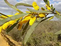 The slender, straggly, weeping tree or shrub typically grows to a height of 1 to 4 metres (3 to 13 ft).[1] The pendulous or arching branchlets are often covered in a fine white powder. Like most species of Acacia it has phyllodes rather than true leaves. The evergreen phyllodes usually have a pendulous forn with a linear to linear-elliptic shape and are straight to slightly curved. The grey-green and coriaceous phyllodes have a length of 10 to 20 cm (3.9 to 7.9 in) and a width of 4 to 10 mm (0.16 to 0.39 in) and have numerous fine nerves numerous and a prominent yellow coloured pulvinus.[2] It blooms from August to October producing yellow flowers.[1] The inflorescences occur in groups of one to four flower-spikes with a cylindrical shape. The spikes have a length of 12 to 23 mm (0.47 to 0.91 in) and a diameter of 6 to 7.5 mm (0.24 to 0.30 in). The coriaceous seed pods that form after flowering have a curved to linear shape and are raised over seeds. The pods have a length of up to 7 cm (2.8 in) and have a width of 5 to 6 mm (0.20 to 0.24 in) and are glabrous with a powdery white coating. The glossy dark brown seeds inside are arranged longitudinally and have a compressed subdiscoid shape with a length of 4 to 4.5 mm (0.16 to 0.18 in).[2]