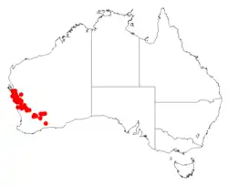 It is native to an area in the Mid West and north western Wheatbelt region of Western Australia where it is often situated on sandplains growing in sandy soils[1] as a part of in heath, scrub and shrubland communities. It is found around Hamelin Pool in the north to around Cockleshell Gully in the south and as far east as Wubin but is not commonly occurring.[2]