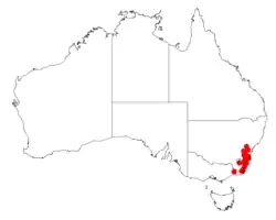 It is found in New South Wales and Victoria on the ranges around the Wolgan River in the north west and along the coast near Nowra in the north east with a range that extends down into Victoria. It is often situated among rocky outcrops as a part of heathland or dry sclerophyll forest communities.[1] In Victoria it is found as far south as the upper Snowy River in the east Gippsland area[3] growing in sandy gravelly soils in and around granite, sandstone and rhyolite.[4]