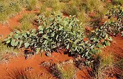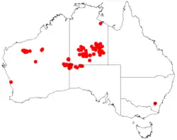 It is native to the north western margins of the Simpson Desert in the Northern Territory in the north down to around the Musgrave and Tomkinson Ranges of South Australia. It is also found in parts of Western Australia. In South Australia it is situated along dry creeks and river beds.[1] In an area in the desert in the Central Ranges of the eastern Goldfields it can be found growing in red sand, stony sand, loamy or clay soils.[2]