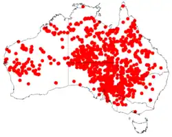Acacia victoriae is found in arid and semiarid areas,[3] generally in alkaline soils including clayey alluvials, grey cracking clays and saline loams on floodplains, alluvial flats, rocky hillsides and ridges.[4] Animals such as birds and small mammals are known to use the tree as protection. The seeds and foliage also offer a source of food to animals.[5]