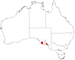 It is found on limestone and loam, sometimes near salt swamps, but only in the near-coastal areas south of Tumby Bay on the Eyre Peninsula, South Australia.[5]