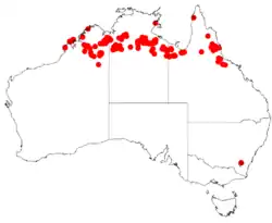 It is native to an area in the Kimberley region of Western Australia where it is found along the banks of watercourses and on stony plains growing many soil types over or around sandstone and shale.[1] It is also found across the Barkly Tableland and Katherine regions of the Northern Territory and northern Queensland.