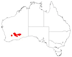 The species is endemic the desert and dry scrublands in southern parts of central Western Australia.[2]