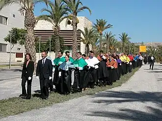 The professorial Talar can be described as a long black gown with wide sleeves, often with lapels in faculty colour, while deans wear a Talar completely in faculty colour. Rectors typically have a distinguished, more elaborate Talar, e.g., made of velvet, coloured in red, or with gold embroidery.[14][15] At some universities, the rector additionally wears a chain of office and, at some occasions, carries a scepter.[16][17] The cap that accompanies the Talar is called Barett. As is the case with the Talar, which type of cap is used varies by university as well. Historically, caps made of soft materials rather than the square academic cap are common. The colour of the Barett matches the Talar.[15]