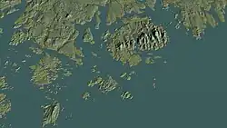 That same day we also passed near an island about four or five leagues [12–15 mi; 19–24 km] in length, off which we were almost lost on a little rock, level with the surface of the water, which made a hole in our pinnace close to the keel. The distance from this island to the mainland on the north is not a hundred paces. It is very high and cleft in places, giving it the appearance from the sea of seven or eight mountains one alongside the other. The tops of them are bare of trees, because there is nothing there but rocks. The woods consist only of pines, firs, and birches.[28]