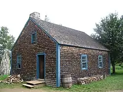 The Magdalen Islands, which now belong to Quebec, were colonized in successive waves, mainly by Acadians between 1755 and 1792.[22] As was the case elsewhere, the first houses were provisional and were hastily constructed to replace them later with more comfortable houses. However, these houses served for a longer period than was anticipated and retained a rustic character for approximately a century.[23] The initial construction of the houses was accomplished with the use of round logs, which were subsequently replaced by planks. These planks were caulked with moss and clay. The houses exhibited dovetail joints at the corners, although some houses, designated as "corner houses," were constructed with planks joined with wooden plugs.[24] In subsequent periods, houses were constructed with planks split in two and installed vertically.[23] These were tongue-and-groove structures, in which a groove was cut along the length of both sides of the plank and a lath was installed in one of the grooves, allowing the planks to be joined together. The houses were generally square, averaging six meters per side but no more than ten meters. Frequently, a lean-to was added, a smaller room built in the style of the house, used as a kitchen, dining room, and living room. A ladder led to the attic, where seeds and equipment were stored. A flat-roofed drum was often constructed at the entrance of the lean-to, serving both as a storage space and protection against the winter wind.[24]