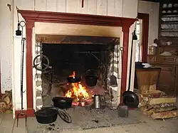From this period onwards, the construction methods and appearance of houses were no longer determined by the availability of materials and tools, but rather by the lifestyle of the owner.[43] Houses became more spacious, and the log construction method disappeared, except in some isolated villages.[26] The most popular construction method was timber framing, covered with planks and generally with a stone foundation.[26] This type of construction allowed for even larger houses, with each room now built for a specific use.[26] In particular, around 1860, the large kitchen was divided into two, forming a kitchen at the back of the house and a small living room facing the main entrance.[44] This new room was borrowed from English Canadians.[26] Interior walls were increasingly plastered to make them more attractive and easier to maintain.[26] Various types of doors were now used.[26] Henceforth, the kitchen door was most often placed opposite the entrance door.[45] The staircase, generally located in the kitchen, became more elaborate.[26] The configuration of stairs remained consistent, with the first two steps leading to a landing where a door provided access to the remainder of the stairs.[44] The trapdoor leading to the cellar remained in the kitchen, situated near the stairs.[44] Around 1850, the square stove was replaced by the double-deck stove, also known as the French stove or the more expensive Star stove. These stoves were used for both cooking and heating.[30] The majority of residences were equipped with two stoves, one in the kitchen and the other upstairs.[44] Some dwellings began to be illuminated by paraffin lamps.[30]