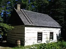 Madawaska was colonized from 1785 onwards by Acadians, as well as French Canadians and English Canadians. The inhabitants of the region were generally referred to as Brayons. The Brayons constructed houses that were similar in design to those found in other Acadian regions.[36] These houses were small, with a single room and no more than two windows, and were built piece by piece using squared logs and heated by a single chimney made of stones bound with a type of clay mortar. Three methods were employed to affix the pieces of wood.[37] The most prevalent was the post-and-plank technique, which used tenons and mortises. The second was the doghead technique or half-dovetail. The third technique, designated "stacked and pinned," entailed sawing the logs at the corners of the house, stacking them alternately one on top of the other, drilling two vertical holes in the logs, and affixing them together with long wooden pins. Only a few known houses were constructed in this manner.[37] Upon their arrival, the settlers adopted Maliseet construction techniques, particularly the use of birchbark for insulation, both for houses and churches or sawmills.[38] However, as soon as their settlement became more significant, the Acadians ceased covering their buildings with birch, and Maliseet influence in architecture disappeared around 1800.[39]