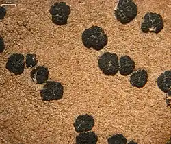 Several Acarosporaceae taxa act as pioneer species, readily colonizing newly exposed substrates. They can inhabit man-made surfaces—such as stone walls, gravestones, and concrete—and certain species, like Sarcogyne pruinosa (syn. S. regularis), are particularly common on concrete, while A. moenium is reported from various urban settings. Within the family, no sterile leprose taxa have been described, and only one sorediate species, A. moenium, is recognized; it produces a white thallus with black soralia. Pycnidia, although not present in every species, show considerable diversity in the genus Trimmatothelopsis. Many Acarosporaceae replicate by fragmentation of their thallus and apothecia. Species such as A. applanata (from southwestern North America) and A. fissa (from the Czech Republic) are known for extensive crosshatching by abscission fissures; they seldom produce apothecia and primarily propagate through division.[8]