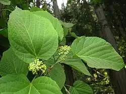 Deciduous trees or large shrubs, small to medium height (5–10 m tall), yellow-gray branches that are rather densely branched. Leaves are undivided, deeply cordate, margins crenate, ovate, not lobed, 10–15 cm long and 5–8 cm wide, gray-green. Undersides pale green, shining and glabrous, pinkish gray when young. The fall color is yellow. Flowers are sepals hairy; discs lobed; stamens inserted between the lobes.[6]