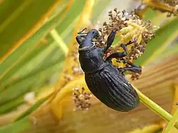 Aciphylla squarrosa has a species of beetle, the speargrass weevil (Lyperobius huttoni), which completely depends on it for food: adults feed on the leaves and flower stalks, and larvae on the roots, although it appears to do little damage to adult speargrass. The decline of A. squarrosa on the mainland and predation by rats and mice had reduced the North Island L. huttoni population by the 2000s to around 150 individuals, living on cliffs of Wellington's south coast.[21] A. squarrosa grows at low altitudes on both the south coast and nearby rodent-free Mana Island, so in 2006–2007 40 weevils were translocated to a speargrass patch on Mana, where they have bred successfully and spread.[22]