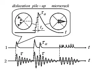 The mechanism of emission of the primary elastic pulse AE (act or event AE) may have a different physical nature. The figure shows the mechanism of the AE act (event) during the nucleation of a microcrack due to the breakthrough of the dislocations pile-up (dislocation is a linear defect in the crystal lattice of a material) across the boundary in metals with a body-centered cubic (bcc) lattice under mechanical loading, as well as time diagrams of the stream of AE acts (events) (1) and the stream of recorded AE signals (2).[5][6]