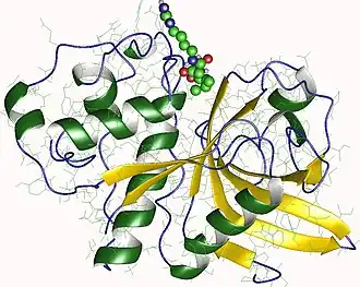 Actinidain is similar to papain in size, shape, active site location and conformation, as well as in kinetic studies, which is especially interesting as they only share 48% amino acid similarity.[2][12] Electron density mapping shows similar α-helices and overall polypeptide folding.[2][12] While the electron density map indicates 218 amino acids, further sequencing work suggests 220 amino acids with the extra two being found at the C-terminus.[12][13] The active site includes cysteine and histidine residues that are conserved across several other proteins in the fruit peptidase family.[13] Electron density mapping indicates a double crossover with domain 1 being made up of AA 19-115 and 214-218 and domain II composing of AA 1-18 and 116-213,[12] with both the N-terminal and the C-terminal ends crossing over into both domains. Domain 1 has several α-helices whereas domain 2 is primarily made up of one anti-parallel β-sheet.[12] Actinidain comprises up to 50% of the soluble protein content in kiwifruits at harvest.[17] Actinidain is active over a wide range of pH, including very acidic conditions,[18] with a pH optimum from 5-7.[19] At least ten different isoforms that all have the same molecular weight and cysteine protease activity as actinidain have been identified but they vary in isoelectric point from acidic (pI 3.9) to basic (pI 9.3).[17]