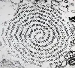 The most distinctive characteristic of the actinophryids is their axopodia. These axopodia consist of a central, rigid rod which is coated in a thin layer of ectoplasm. In Actinophrys the axonemes end on the surface of the central nucleus, and in the multicellular Actinosphaerium they end at or near nuclei.[5] The axonemes are composed of microtubules arranged in a double spiral pattern characteristic of the order.[8] Due to their long, parallel construction, these microtubules demonstrate strong birefringence.[9][10]