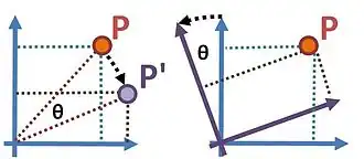 In the active transformation (left), a point P is transformed to point P by rotating clockwise by angle θ about the origin of a fixed coordinate system. In the passive transformation (right), point P stays fixed, while the coordinate system rotates counterclockwise by an angle θ about its origin. The coordinates of P after the active transformation relative to the original coordinate system are the same as the coordinates of P relative to the rotated coordinate system.