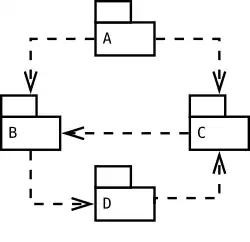 In this UML package diagram, package A depends on packages B and C. Package B in turn depends on package D, which depends on package C, which in turn depends on package B. The latter three dependencies create a cycle, which must be broken in order to adhere to the acyclic dependencies principle.[2]