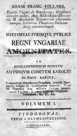- ^ The unadjusted spelling of the title: Historiae ivrisqve pvblici Regni Vngariae amoenitates. ("Amenities of the History and Constitutional Law of the Kingdom of Hungary.")