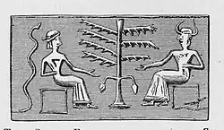 The Adam and Eve cylinder seal, also known as the "temptation seal", is a small stone cylinder of post-Akkadian origin, dating from about 2200 to 2100 BC. The seal depicts two seated figures, a tree, and a serpent, and was formerly believed to evince some connection with Adam and Eve from the Book of Genesis. It is now seen as a conventional example of an Akkadian banquet scene.[2]