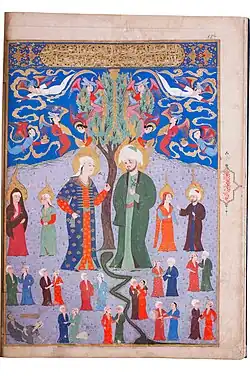 The Qur'an describes Adam in two different scenarios.[4] In the first, Adam is created in heaven and the angels are commanded to prostrate themselves before him by God. In the second scenario, Adam dwells in a paradisical Garden with his wife identified as Ḥawwāʾ in Islamic tradition. While Adam is mentioned in the Qur'an by name, his method of creation is neither explained nor specified.[5]