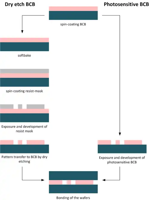 Benzocyclobutene (BCB) is a hydrocarbon that is widely used in electronics manufacturing.[16] BCB exists in a dry etch and a photosensitive version, each requiring different procedural steps for structuring (compare BCB process flow).[17]
