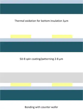The standard process (compare to figure "Schematic bonding process") consists of applying SU-8 on the top wafer by spin-on or spray-on of thin layers (3 to 100 μm).