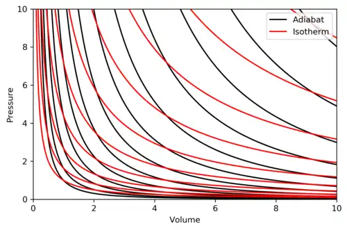 5. If adiabats and isotherms are graphed at regular intervals of entropy and temperature, respectively (like altitude on a contour map), then as the eye moves towards the axes (towards the south-west), it sees the density of isotherms stay constant, but it sees the density of adiabats grow. The exception is very near absolute zero, where the density of adiabats drops sharply and they become rare (see Nernst's theorem).