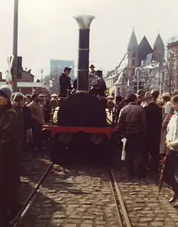 To celebrate the centenary of the railways in Germany in 1935, a replica of the Adler was built beginning from 1933 by the Deutsche Reichsbahn in the Kaiserslautern repair shop (Ausbesserungswerk), which was largely true to the original. The original idea of the President of the Reichsbahn Julius Dorpmüller and the members of his staff was to use the Adler-replica as an instrument of propaganda for the "new era" in the city of the Reichsparteitag Nuremberg. They planned to contrast the Adler with modern gigantic steam locomotives like the high-speed DRG Class 05. For the realisation of the replica they used the results of the planning in 1925. Besides of different technical data the replica differed from the original with thicker boiler casing and additional cross bracings and spokes wheels made of steel.[12] The replica attained an average speed of 33.7 km/h in tests on an 81 kilometre stretch of line. The route had gradients of between 1:110 and 1:140. From 14 July until 13 October 1935, visitors could travel with the reconstructed Adler-train on a track length of two kilometres on the area of the centenary exhibition in Nuremberg. On the driving cab were also the President of the Deutsche Reichsbahn Julius Dorpmüller and the Gauleiter of Franconia Julius Streicher. The Adler-replica was in use after that in 1936 at the Cannstatter Wasen in Stuttgart and during the 1936 Summer Olympics in Berlin. During the 100-years-jubilee of the first Prussian railway in 1938 the Adler-train was in service between Berlin and Potsdam. After this event the Adler-train was sent to the Nuremberg Transport Museum.