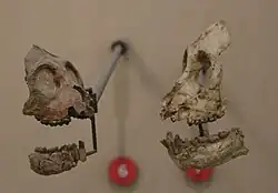 In Egypt's Fayum Depression a subadult female cranium, CGM 85785, was discovered by Rajeev Patnaik.[6] This specimen's cranial capacity was found to be 14.63 cm3 and reanalysis of a male endocast (CGM 40237) estimates a cranial capacity of 21.8 cm3.[6] These estimates dispel earlier ones of approximately 30 cm3.[6] These measurements give an estimated male to female endocranial ratio of approximately 1.5, indicating A. zeuxis to be a dimorphic species.[6]