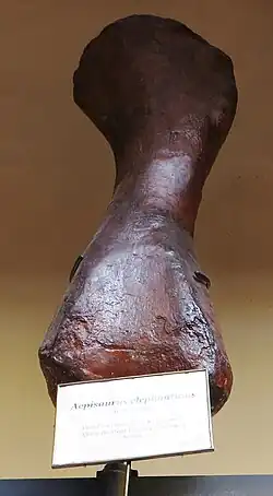 French paleontologist Paul Gervais described the new genus in 1852[1] based on a humerus found at Mont Ventoux, near Bédoin, by Prosper Renaux (1793–1852) in 1841.[2] The bone was 90 cm (35.43 in) long, 33 cm (13 in) wide at the proximal end, 15 cm (5.91 in) wide in the middle, and 25 cm (9.84 cm) wide at the distal end. From the same locality, he referred a conical tooth he thought could belong to a larger second species, and from elsewhere added to A. sp. (a practice used to denote that the remains belong to a certain genus, but the species is not known) a partial humerus and ulna.[1] The proximal part of the humerus of Aepisaurus elephantinus is housed in the University of Montpellier (BED01). A plaster cast of the complete specimen is also displayed in the Muséum national d'Histoire naturelle in Paris (MNHN 1868–242).[2]