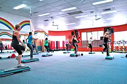 Step aerobics in a gym