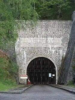 Similar undetected faults were discovered when excavating the underground chamber for Deanie power station.[18] The tunnel from Loch Monar terminates in a surge shaft just behind the power station, which is accessed through a road tunnel, to allow vehicles to reach the station. The tunnel entrance has a stone portal, probably built of stone excavated when building the main chamber. Two Francis turbines produce 38 MW of power, and the water is discharged into the adjacent Loch Beannacharan.[19] An aqueduct intercepts streams to the north of Loch Beannacharan, and additional water is discharged into the main Deanie pipeline.[17]