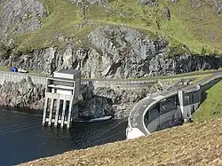 To the north in Glen Strathfarrar, Loch Monar is dammed, and a 5.6-mile (9 km) tunnel carries water to an underground power station at Deanie. The dam is the only example of a double-arched dam to be constructed in Britain. Single-arched dams, which curve in the horizontal plane, had been in use since 1911, but the double-arched dam, which also curves in the vertical plane, was relatively untried, although a number of dams of this design were built in the United States from the late 1960s onwards. The design was possible in this location because it was located in a gorge, the sides of which provided the necessary strength to resist the thrust of the arch. The estimated cost was around nine percent lower than for a mass gravity dam, and the dam wall is only 11.5 feet (3.5 m) thick in places.[14] Construction proved more difficult than expected, due to an undetected fault in what was thought to be solid rock. The Board were always keen to assist engineers and manufacturers in trying out new designs, and this may have been part of the rationale for using a double arched dam. A large number of strain gauges, resistance thermometers and other instrumentation were built into the dam, to provide scientific data on the stresses within such a structure.[15] A second arm of Loch Monar was closed by the Loichel dam, which was a mass gravity dam. It is 680 feet (210 m) long and rose 65 feet (20 m) above its foundations.[16] An aqueduct intercepts several streams to the south of the dam, providing additional water which would otherwise discharge into the River Farrar.[17]